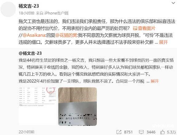 对于俱乐部以各种理由拖欠球员工资,却未受到处罚,杨文吉在回复中写道:“拖欠工资也是违法的,我们违法我们承担责任,那为什么违法的俱乐部和纵容违法的足协不用付出代价,不用承担行业内的最严厉的处罚呢?”